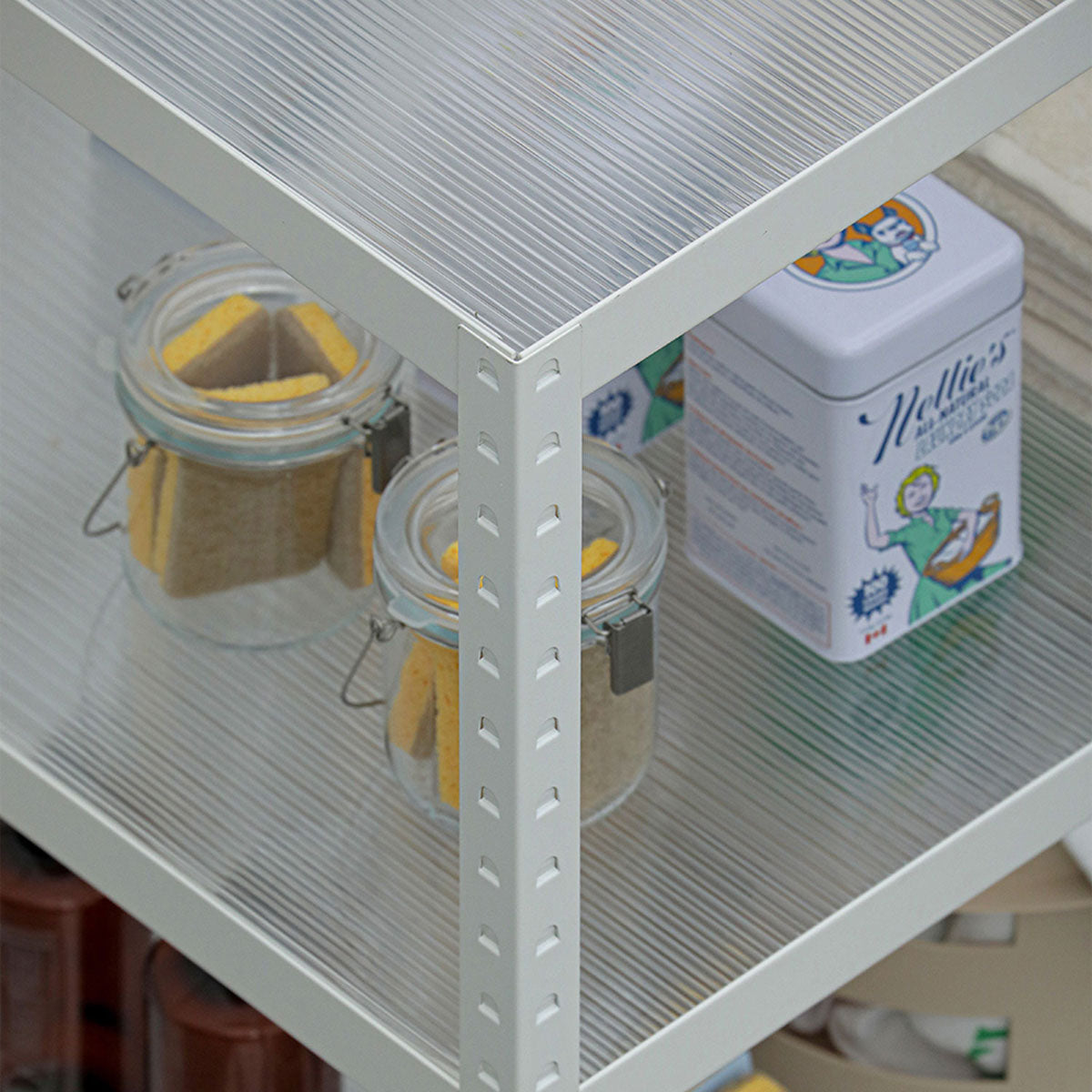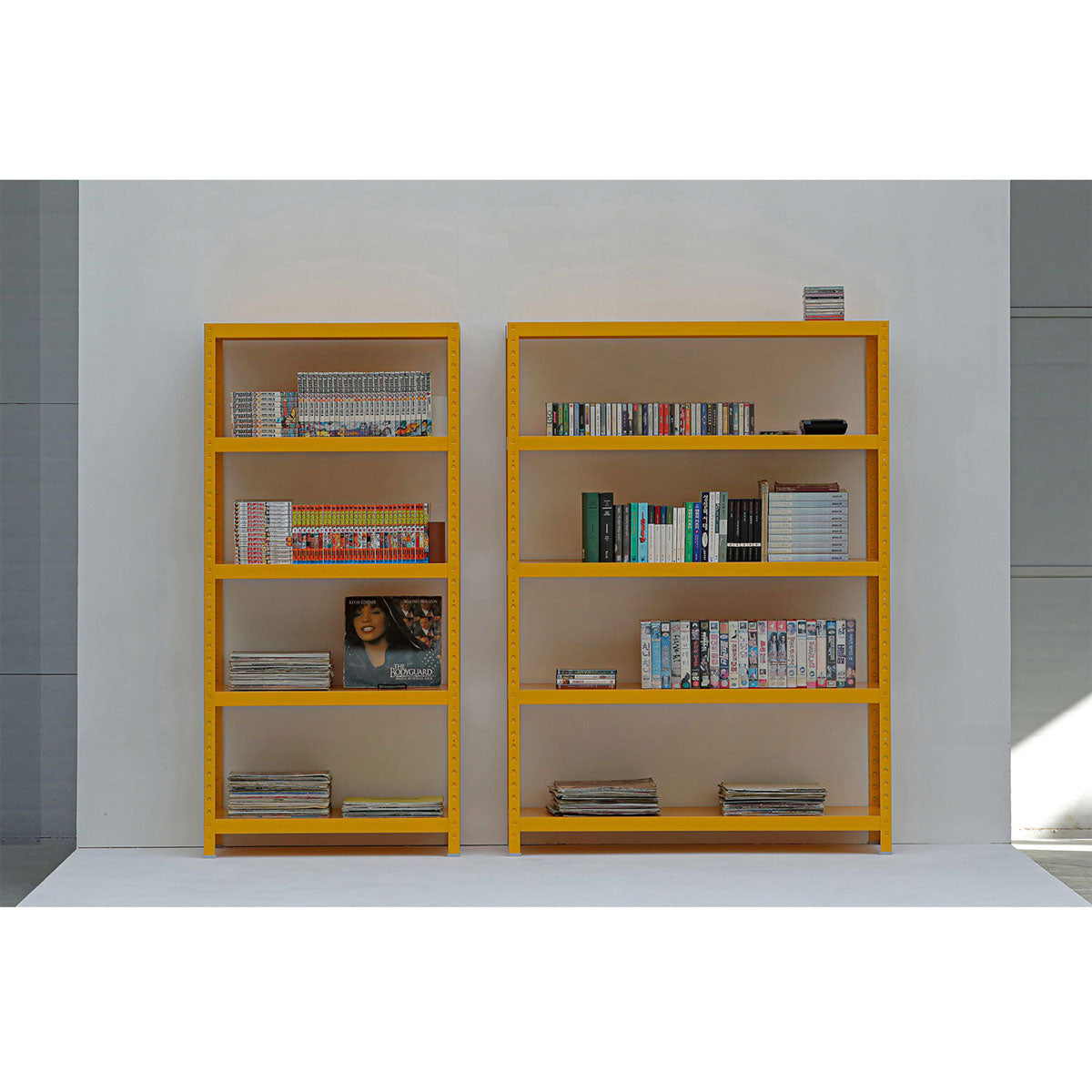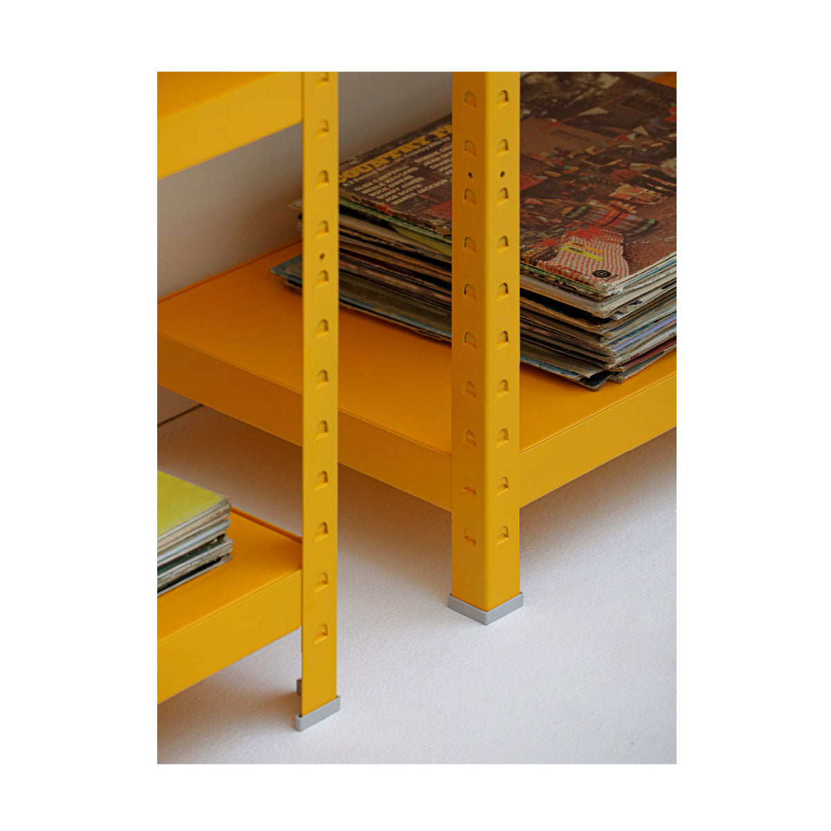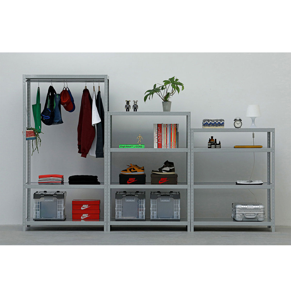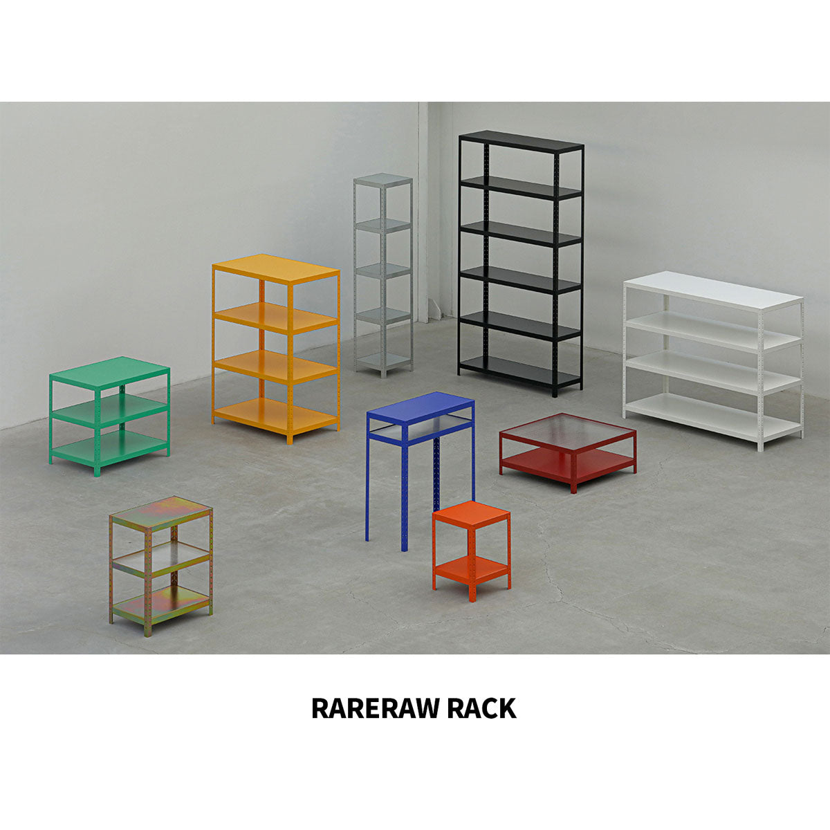 Rareraw's modular storage furniture. Extremely firm and steady. Each steel shelf can hold up till 30kg; while the poly-carbonate shelf can hold up till 20kg.